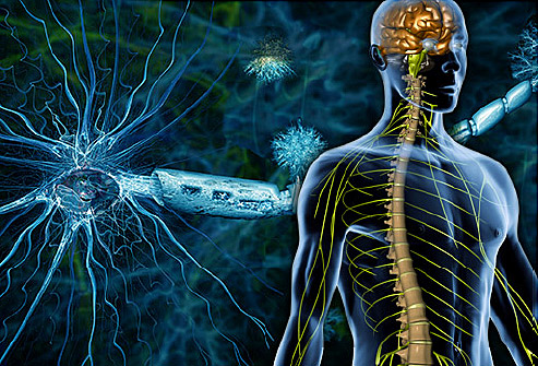 Multiple sclerosis (MS) occurs when the immune system harms myelin. Myelin is a cover around nerve cells. It helps send messages between the brain and body. These messages control vision, feeling, and movement.