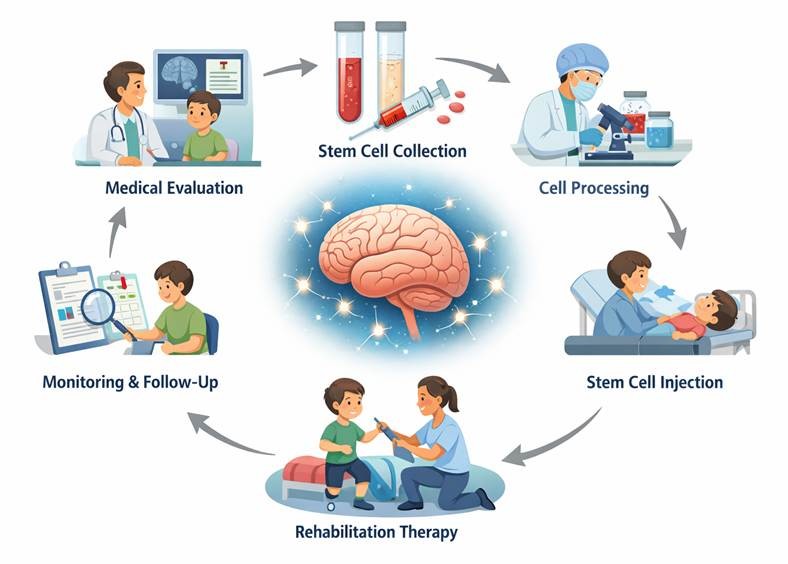 Stem cell treatment for cerebral palsy follows a structured approach that focuses on repairing damaged brain tissues and improving neurological function. The process is carefully planned based on the patient’s condition, age, and severity of symptoms.