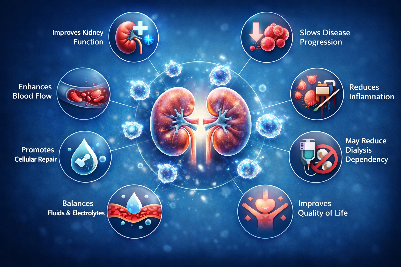 Once administered, stem cells begin working by repairing damaged kidney tissues, supporting regeneration, and improving overall organ function.